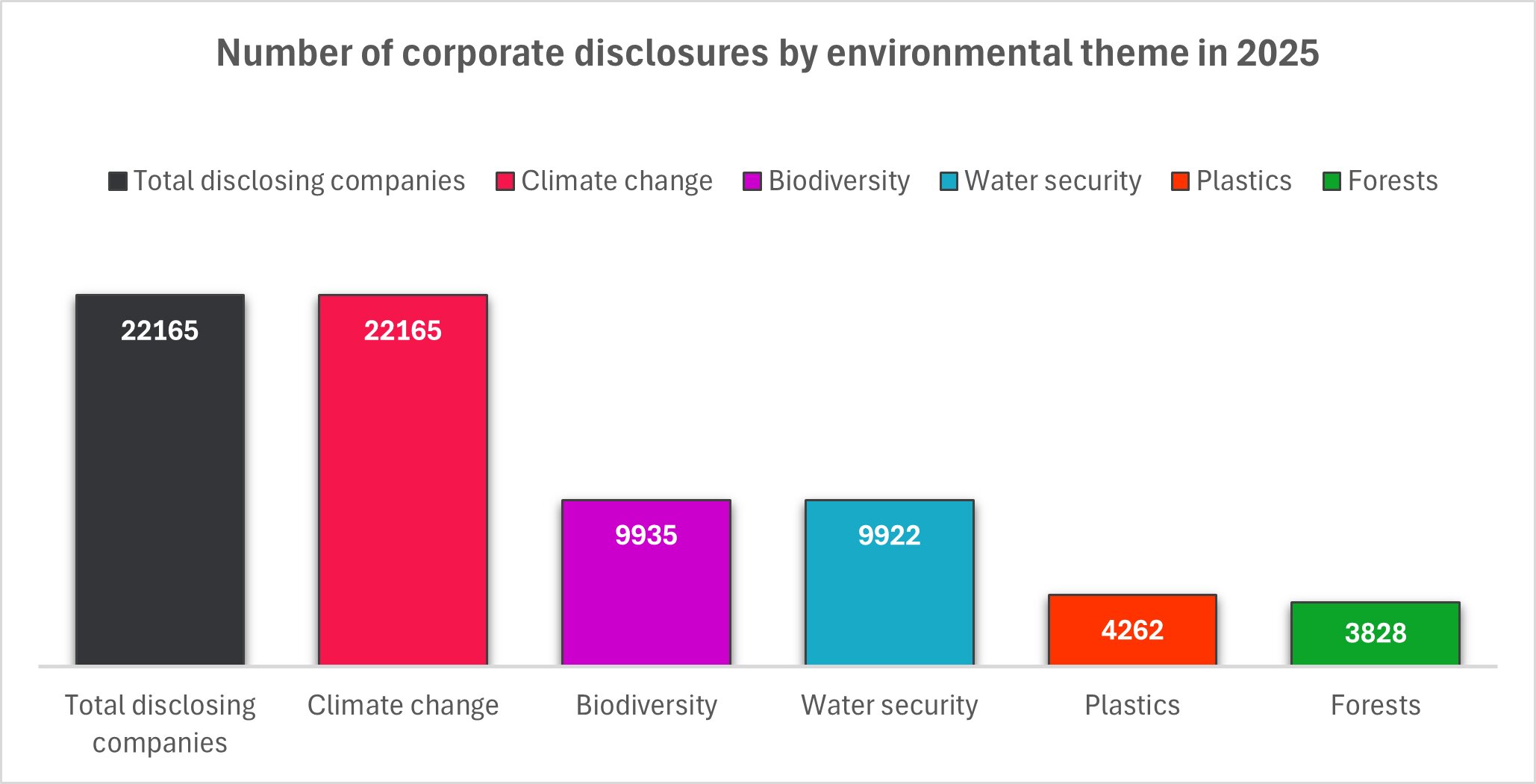 The number of organizations reporting on forests, water security, and plastics increased, and globally, the number of companies reporting jointly across climate change, forests, and water security also rose. This trend highlights a shift toward more holistic environmental reporting.