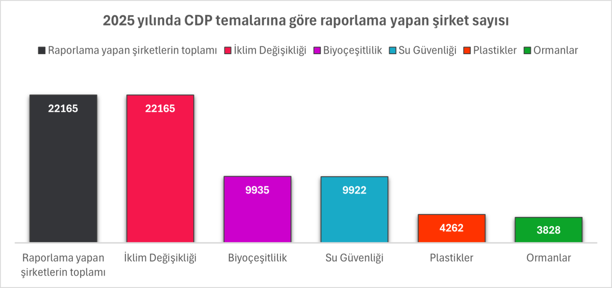 Küresel zorluklara rağmen, 2025 yılında dünya genelinde 23.100’den fazla kuruluş (şirketler, şehirler, eyaletler ve bölgeler) CDP aracılığıyla gönüllü olarak çevresel verilerini raporladı. Bu veriler; şirketlere, yatırımcılara ve politika yapıcılara doğa-pozitif ve bilinçli kararlar almak için ihtiyaç duydukları içgörüleri sağladı.